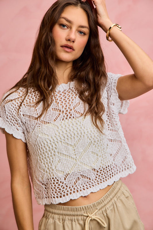 White Short Sleeve Crochet Scallop Edge Knit Cover Up