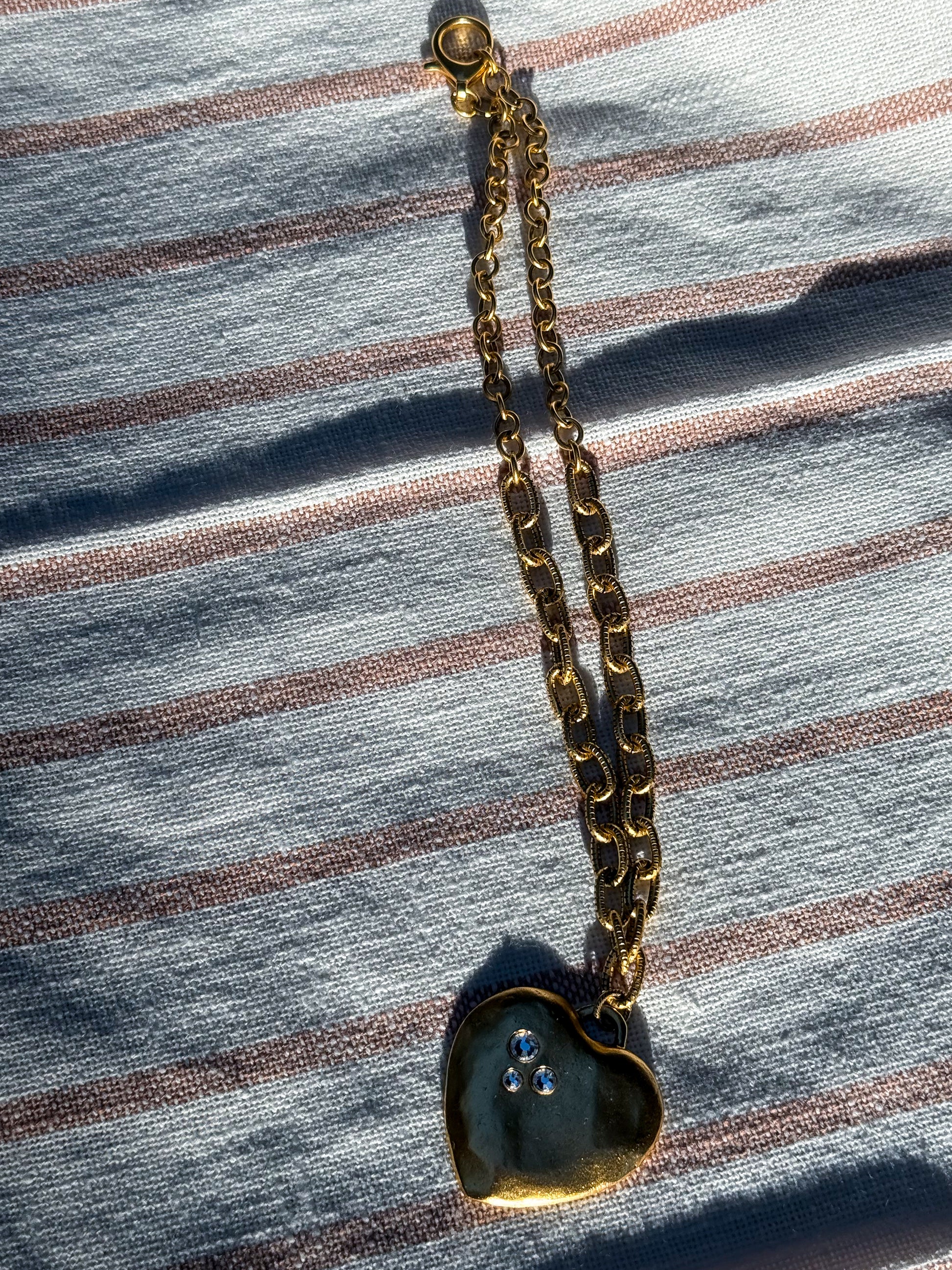 The heart is solid and imperfect in the best way, finished in a soft antiqued gold with just enough shine to catch the light. Each crystal detail feels intentional, like the moments that changed you but didn’t harden you.