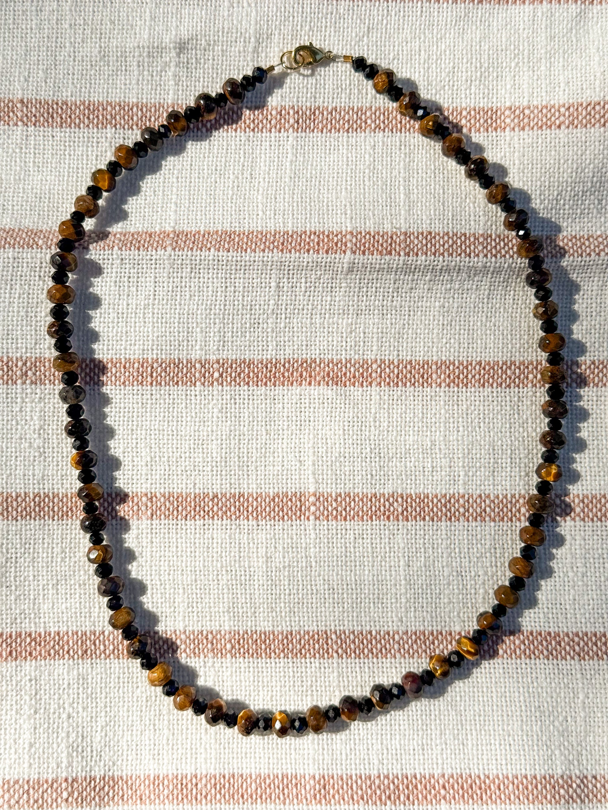 Faceted tiger’s eye meets sleek black rondelle beads in a strand that feels both grounded and bold. The shimmer catches the light just enough to draw attention without trying. Layers beautifully with our antiqued gold puffy heart necklace for an easy, elevated look.