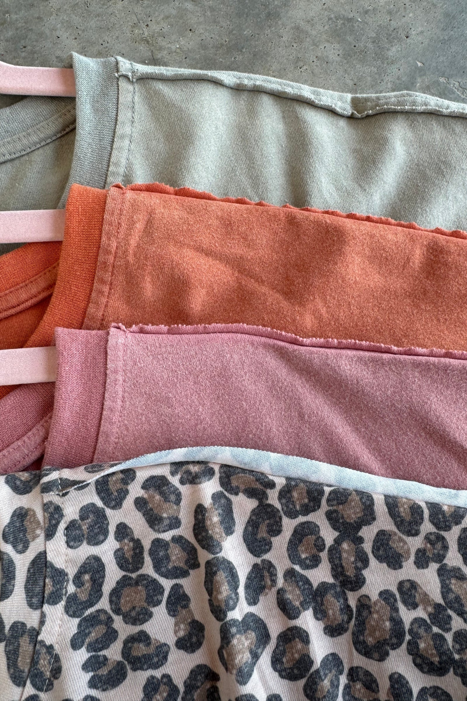 The perfect washed cotton, super soft boyfriend tee that everyone needs! Faded “vintage” colors. Features flattering rounded front and back hem with side slits!