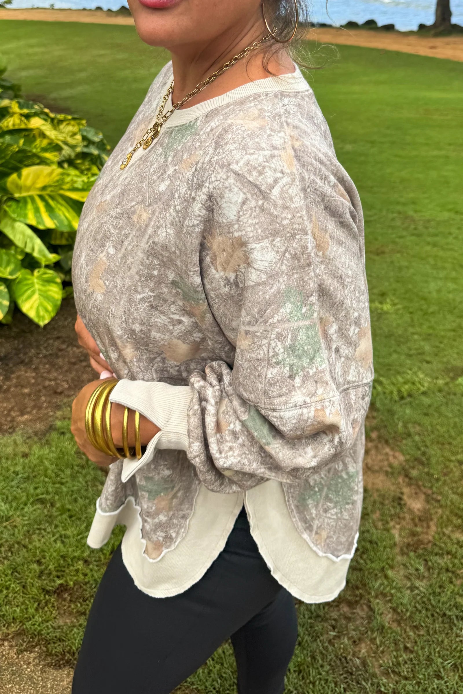 The perfect washed cotton flattering sweatshirt that everyone needs! Faded “vintage” colors. Features flattering rounded front and back hem with side slits!