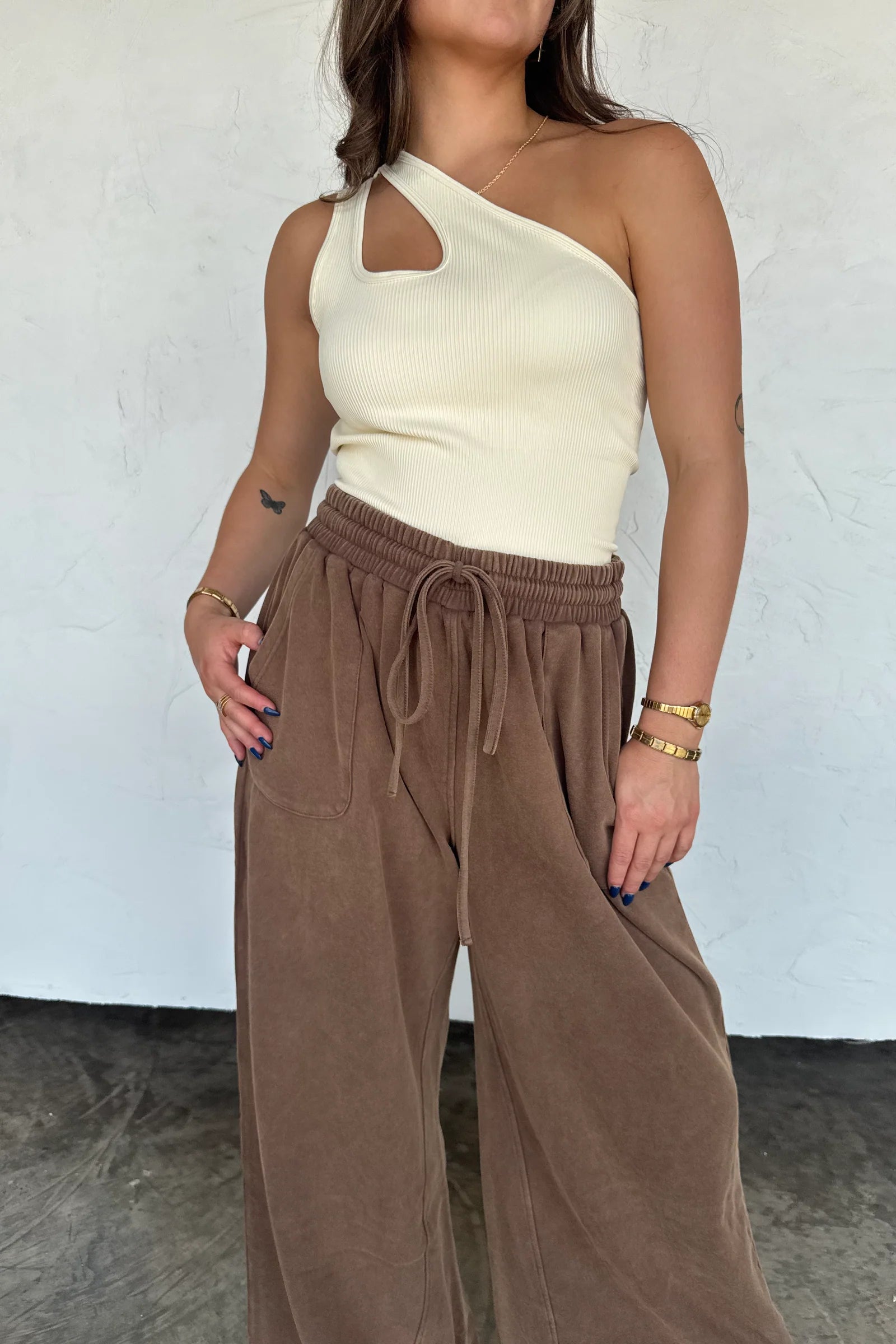 These wide leg pants feature a slight high-rise fit with an adjustable drawstring waistband for all-day comfort. Designed with bold front patch pockets and exposed seam and raw hem detailing, they offer a casual yet elevated look. The washed cotton fabric adds a vintage vibe, while the relaxed wide leg cut keeps them effortlessly cool and easy to style.
